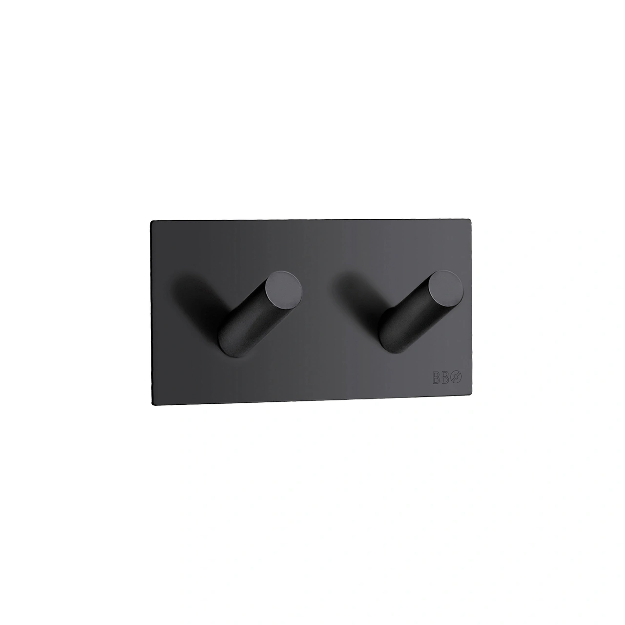 Stylish self-adhesive towel hook in black from Beslagsboden with a back plate that has a stylish design with straight edges. The double hook is made from stainless steel and has a matte black surface that gives your bathroom a sober look.