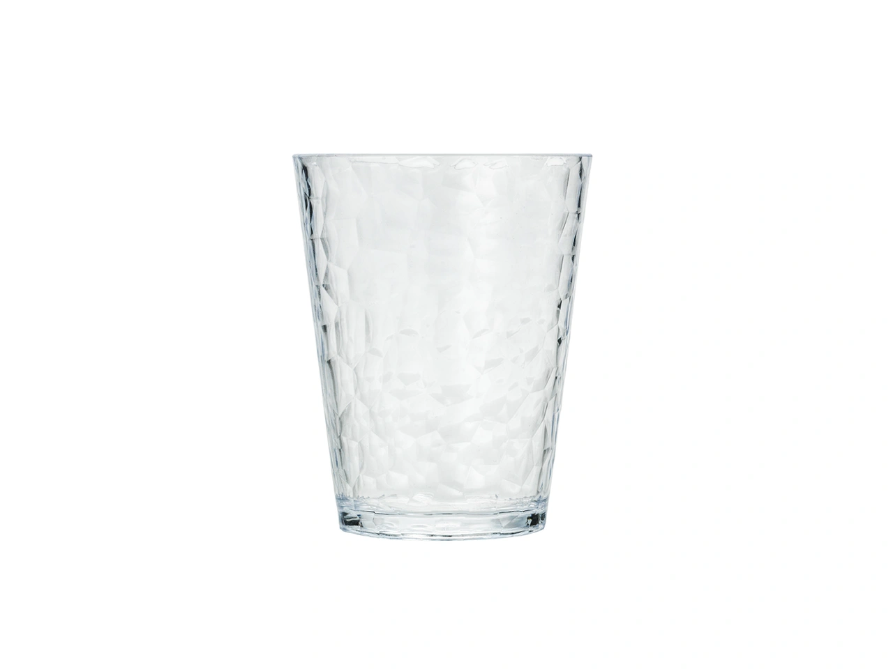 Elegant clear glass made of hammered texture PS plastic. Thin-walled, unbreakable, heat-resistant and suitable for both dishwashers and hot drinks. Ideal for spas, hotel rooms, pool areas, etc., where glassware isn’t practical. PS is also recyclable. Heat-resistant up to 80°C.