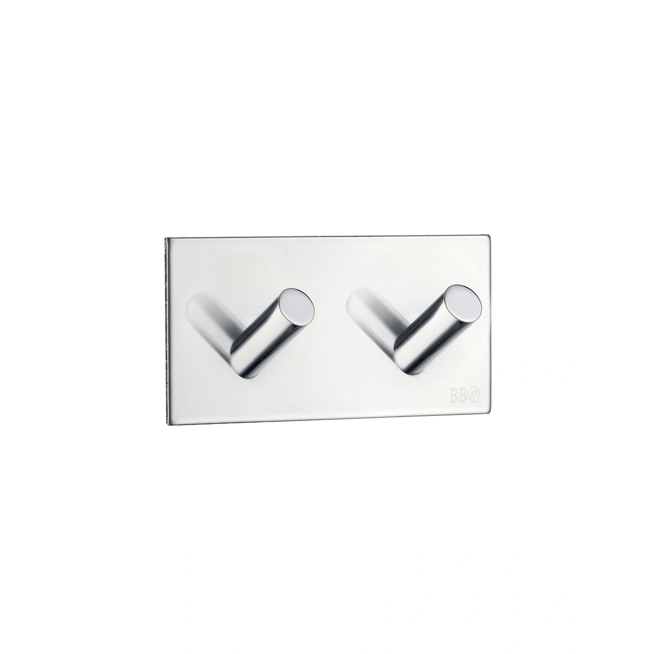 Stylish self-adhesive towel hook in polished steel from Beslagsboden with a back plate that has a stylish design with straight edges. The double hook is made from stainless steel and has a polished surface that gives your bathroom a sober look.