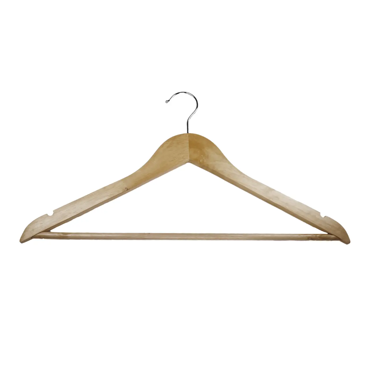 Wooden hanger in light wood. Straight The notches on both sides of the hanger that prevent clothes from slipping off.