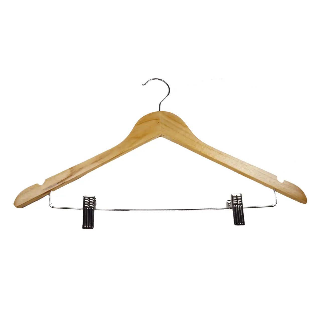 Wooden hanger in light wood. Straight with cross bar and metal clips. This hanger is suitable for skirts or trousers.